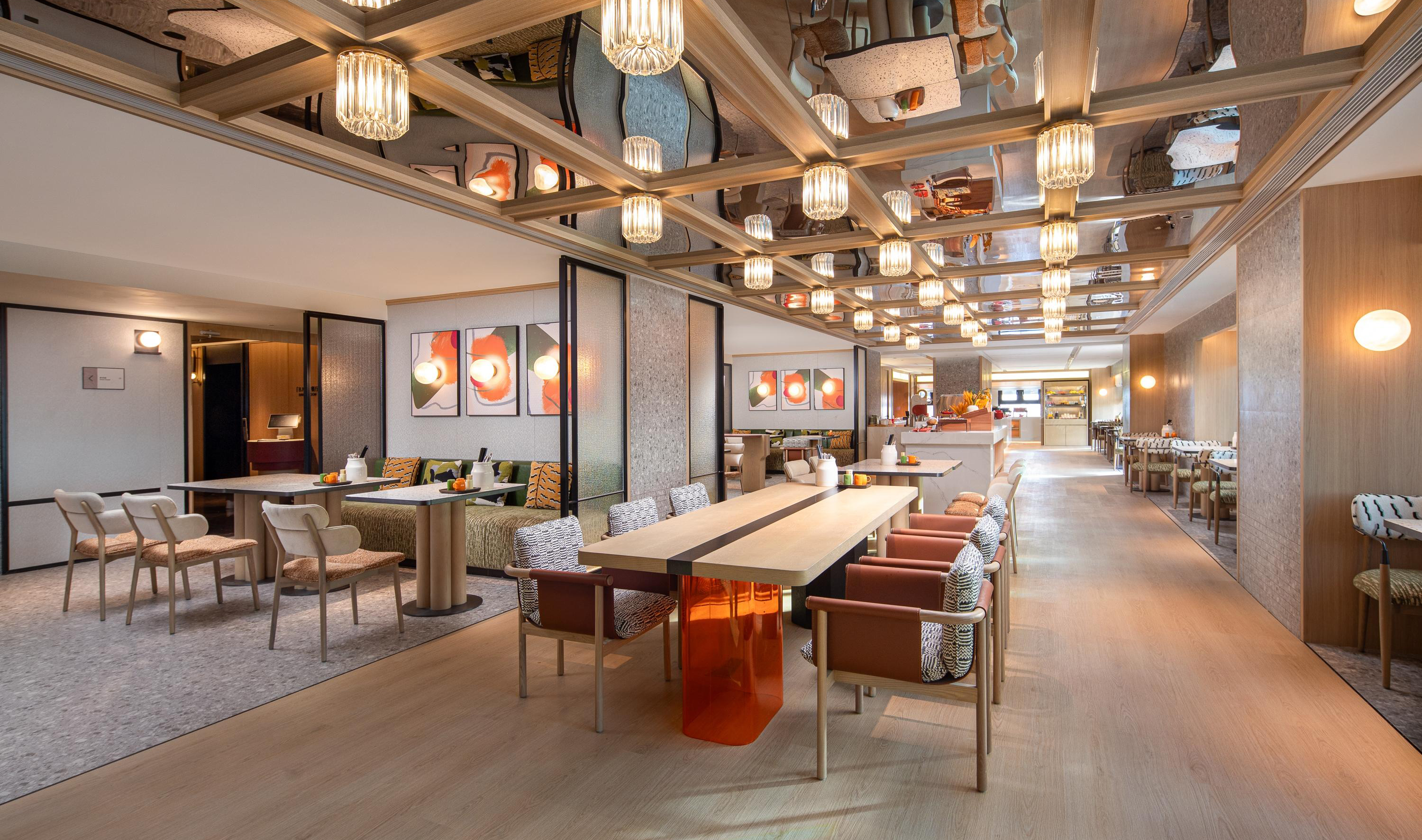 步入位于 28 楼的餐厅,窗外美景与浪漫灯光相得益彰,令人陶醉。餐厅的灯光设计充分结合城市景观,打造独特的用餐体验。天花垂吊的装饰灯与墙面的壁灯透过灯罩洒下柔和光线,既为用餐提供恰到好处的照明,又巧妙营造温馨浪漫的氛围,让整个空间弥漫着浪漫气息。